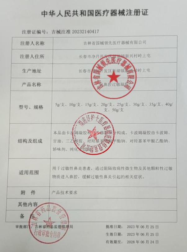 可孚抗鼻腔過敏凝膠由卡波姆凝膠和供給器兩部分構成??ú纺z由卡波姆、甘油、三乙醇胺、對羥基苯甲酸甲酯鈉、對羥基苯甲酸乙酯鈉、矯味劑、純化水組成。用于過敏性鼻炎患者,通過阻隔致病性微生物及其他顆粒性過敏物質進入鼻腔,緩解過敏性鼻炎引起的相關癥狀。