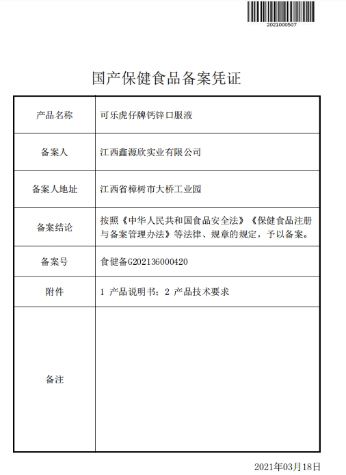 欣源鑫可樂虎仔牌鈣鋅口服液保健功能:補充鈣、鋅;適宜人群:需要補充鈣、鋅的1-17歲人群及孕婦、乳母;不適宜人群:1歲以下人群及成人。1-6歲:每日1次,每次2支;7-17歲及孕婦、乳母:每日1次,每次3支;食用方法:口服。本品不能代替藥物。