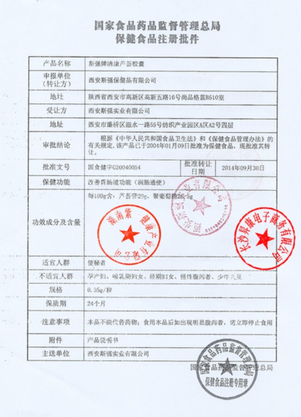 福爾蘆薈聚葡萄糖膠囊保健功能:本品經(jīng)動(dòng)物實(shí)驗(yàn)評(píng)價(jià),具有改善胃腸道功能(潤(rùn)腸通便)的保健功能;適宜人群:便秘者;不適宜人群:孕產(chǎn)婦、哺乳期婦女、經(jīng)期婦女、慢性腹瀉者、少年兒童。每日2次,每次2粒。本品不能代替藥物。食用本品后如出現(xiàn)明顯腹瀉者,請(qǐng)立即停止食用。