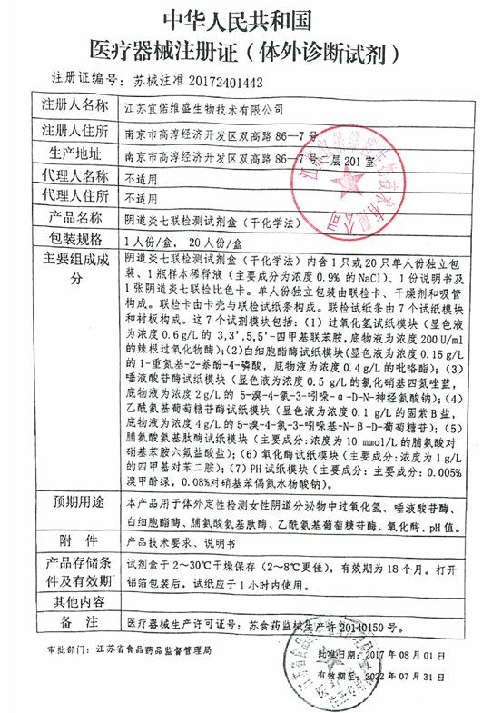 碩世生物陰道炎七聯(lián)檢測試劑盒(干化學法)用于體外定性檢測女性陰道分泌物中過氧化氫、唾液酸苷酶、白細胞酯酶、脯氨酸氨基肽酶、乙酰氨基葡萄糖苷酶、氧化酶、pH值。試劑盒于2~30℃干燥保存(2~8℃更佳),有效期為18個月。打開鋁箔包裝后,試紙應于1小時內(nèi)使用。