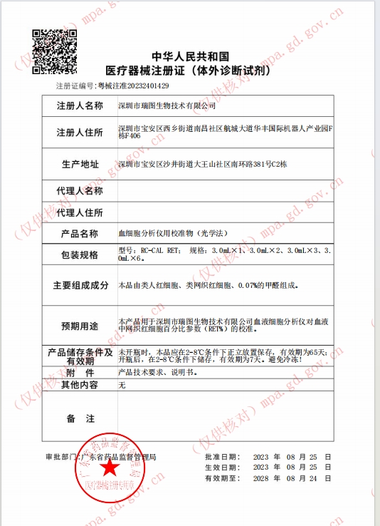 適用范圍:血細胞分析儀用校準物(光學法)用于深圳市瑞圖生物技術有限公司血液細胞分析儀對血液中網(wǎng)織紅細胞百分比參數(shù)(RET%)的校準。