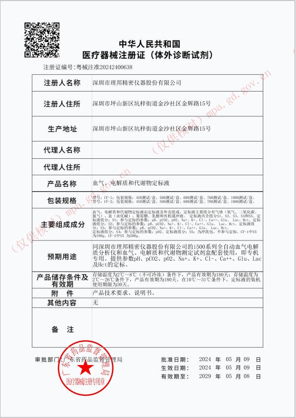 適用范圍:血?dú)?電解質(zhì)和代謝物定標(biāo)液同深圳市理邦精密儀器股份有限公司的i500系列全自動血?dú)怆娊赓|(zhì)分析儀和血?dú)?、電解質(zhì)和代謝物測定試劑盒配套使用,即專機(jī)專用。提供參數(shù)pH、pCO2、pO2、Na+、K+、Cl-、Ca++、Glu、Lac及Hct的定標(biāo)。
