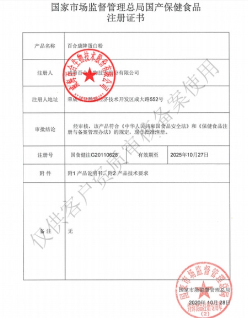 百合康牌蛋白粉的保健功能:本品經(jīng)動物實(shí)驗(yàn)評價,具有增強(qiáng)免疫力的保健功能;適宜人群:免疫力低下者;不適宜人群:嬰幼兒、孕婦、乳母。每日1次,每次10g,沖服食用,附量具。本品補(bǔ)充了蛋白質(zhì),與同類產(chǎn)品同時食用不宜超過推薦量,食用本品期間注意平衡膳食;腎功能異常的人群不推薦食用本產(chǎn)品。