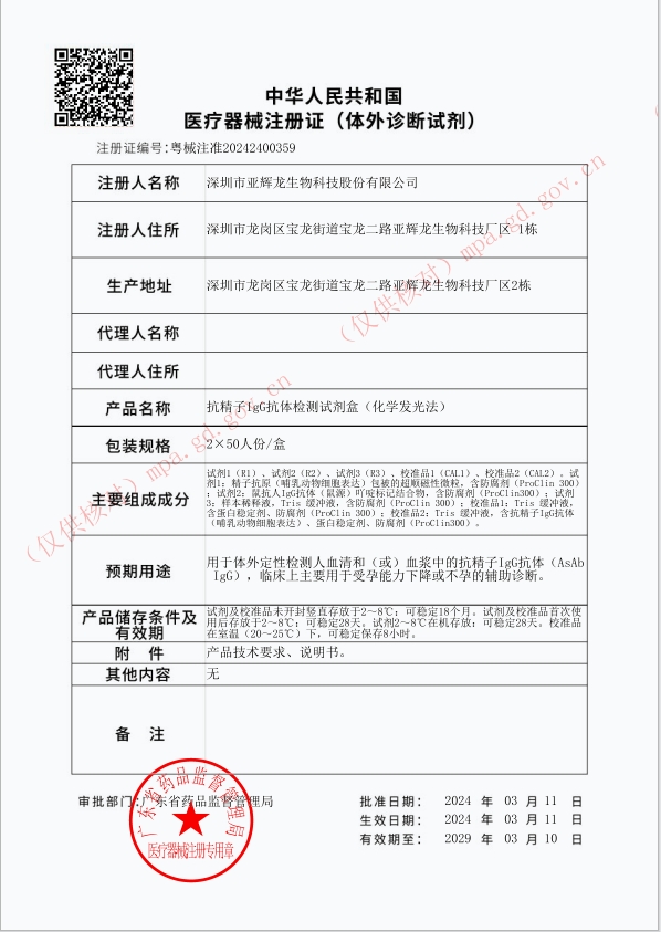 注冊(cè)證號(hào):粵械注準(zhǔn)20242400359批件 生產(chǎn)廠家:深圳市亞輝龍生物科技股份有限公司