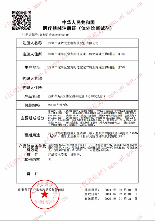注冊證號:粵械注準(zhǔn)20242400208批件 生產(chǎn)廠家:深圳市亞輝龍生物科技股份有限公司