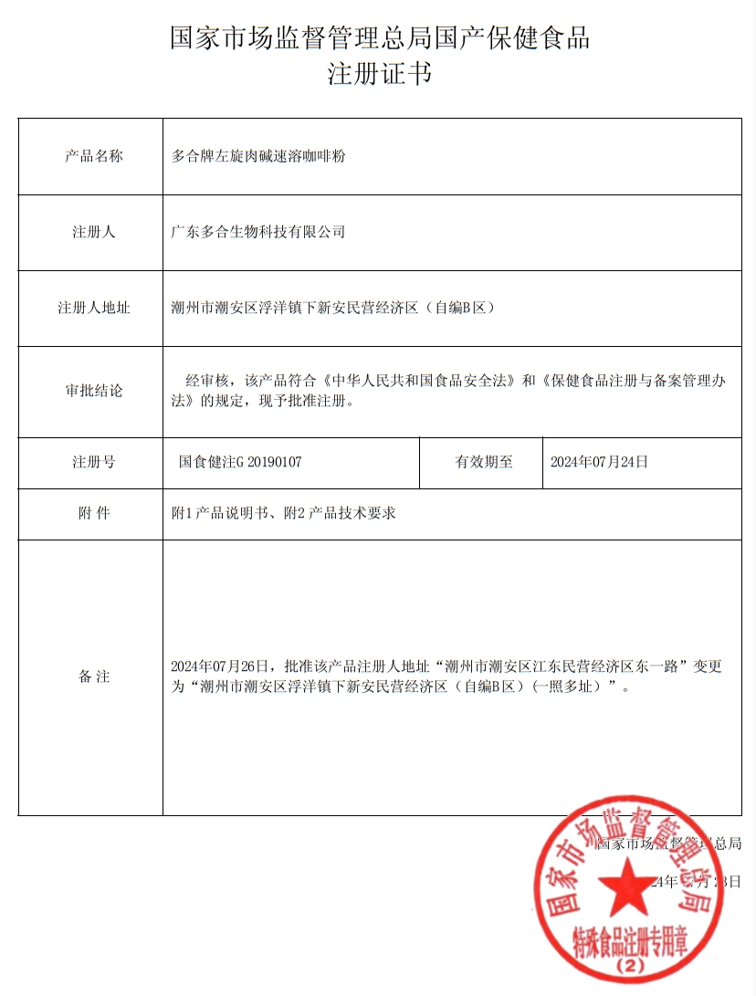 華北制藥多合牌左旋肉堿速溶咖啡粉保健功能:有助于控制體內脂肪;適宜人群:單純性肥胖人群;不適宜人群:少年兒童、孕婦、乳母。每日1次,每次10g;以開水沖調,快速攪拌,即可飲用。本品不能代替藥物。適宜人群外的人群不推薦食用本產品;增加有氧運動。