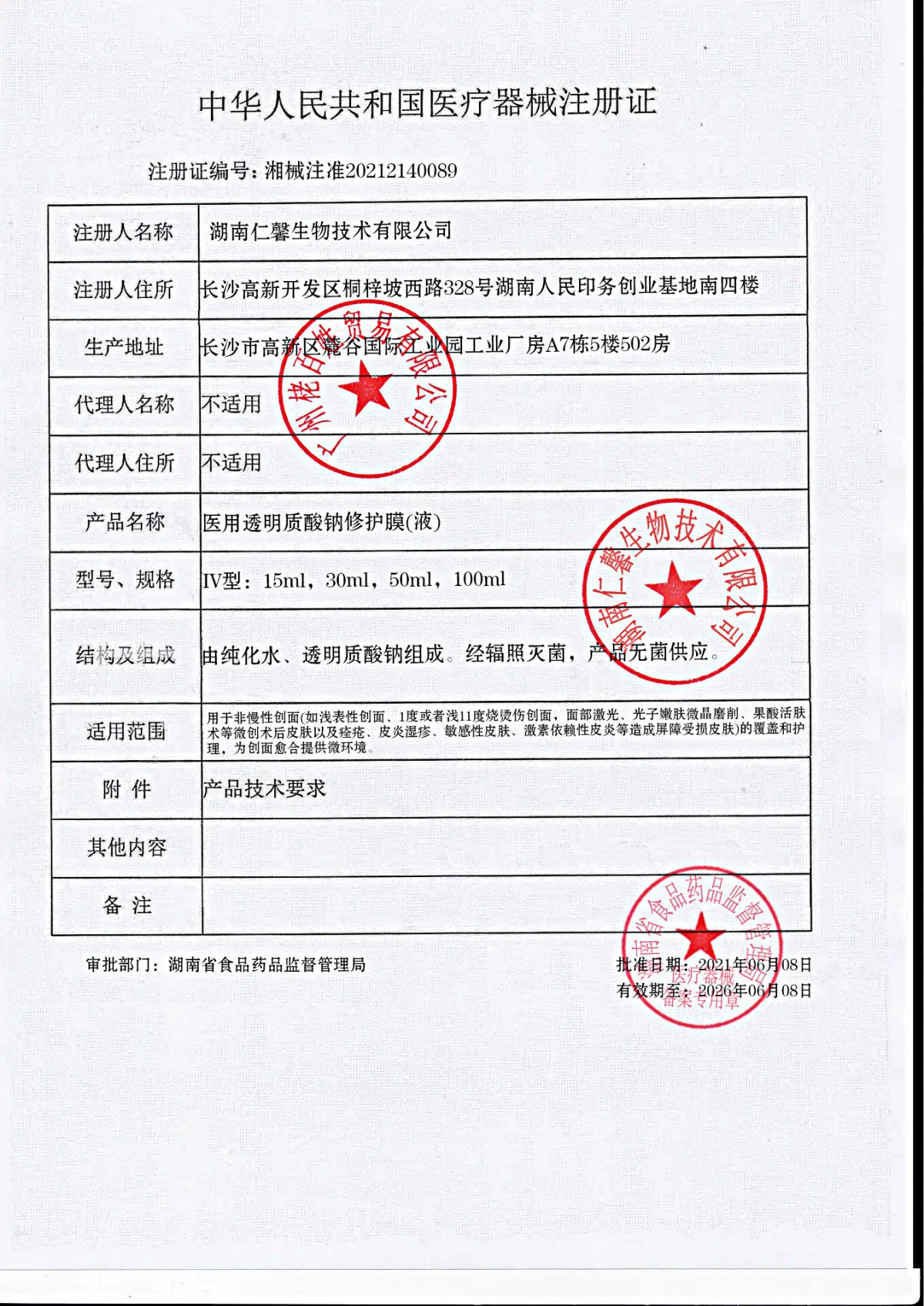 伊珊醫(yī)用透明質(zhì)酸鈉修護(hù)膜(液)由透明質(zhì)酸鈉溶液和基材組成或由透明質(zhì)酸鈉溶液/透明質(zhì)酸鈉粉劑組成,粉劑可配有純化水。透明質(zhì)酸鈉溶液由透明質(zhì)酸鈉、甘油、卡波姆、三乙醇胺、苯氧乙醇和純化水制成。產(chǎn)品無菌供應(yīng)。