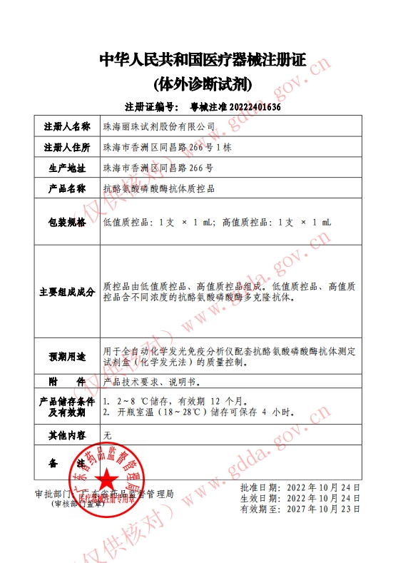 注冊(cè)證號(hào):粵械注準(zhǔn)20222401636批件 生產(chǎn)廠家:珠海麗珠試劑股份有限公司