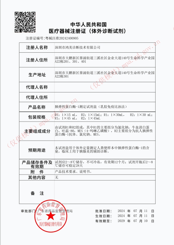 注冊證號:粵械注準20242400905批件 生產(chǎn)廠家:深圳市鴻美診斷技術(shù)有限公司