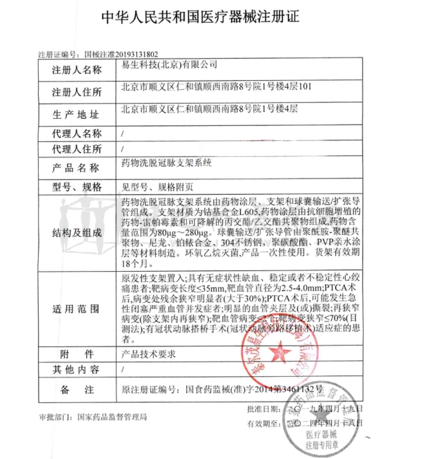 注冊(cè)證號(hào):國(guó)械注準(zhǔn)20193131802批件 生產(chǎn)廠家:易生科技(北京)有限公司