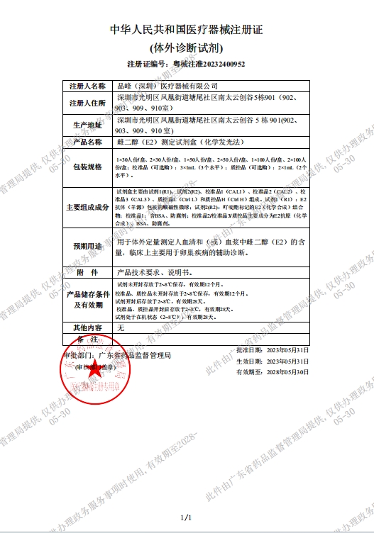 適用范圍:雌二醇(E2)測定試劑盒(化學(xué)發(fā)光法)用于體外定量測定人血清和(或)血漿中雌二醇(E2)的含量,臨床上主要用于卵巢疾病的輔助診斷。