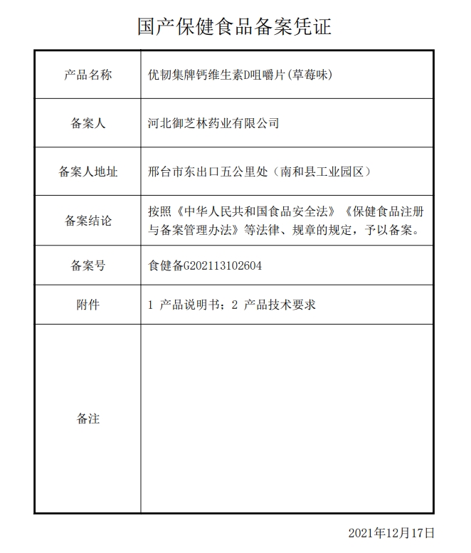 優(yōu)韌集牌鈣維生素D咀嚼片(草莓味)保健功能:補充鈣、維生素D;適宜人群:需要補充鈣、維生素D的4-17歲人群及成人、孕婦、乳母。不適宜人群:3歲以下人群。4-6歲:每日1次,每次1片;7-17歲及成人、孕婦、乳母:每日1次,每次2片;食用方法:嚼食。本品不能代替藥物。