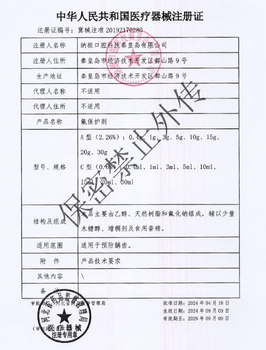 可孚氟保護劑主要由乙醇、天然樹脂和氟化鈉組成,輔以少量木糖醇、增稠劑及食用香精。適用于預防齲齒。