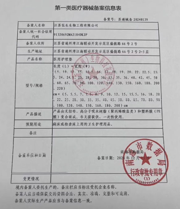 弘生醫(yī)用護理墊由無紡布、高分子吸水樹脂(聚丙烯酸鹽類)和塑料膜(PE膜)復(fù)合而成。非無菌提供,一次性使用。本品為病床或檢查床上用的衛(wèi)生護理用品。使用前請檢查包裝是否完好,并對外包裝標志、生產(chǎn)日期、有效期進行確認,并在有效期內(nèi)使用。