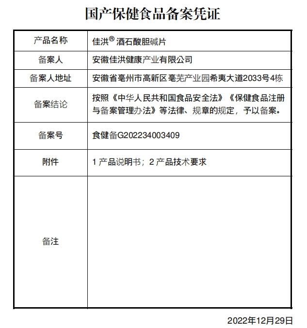 佳洪酒石酸膽堿片(南京同仁堂/樂家老鋪)保健功能:補充膽堿;適宜人群:需要補充膽堿的7-17歲人群及成人、孕婦、乳母;不適宜人群:6歲以下人群。每日1次,每次1片,食用方法:口服或溫開水送服。本品不能代替藥物。適宜人群外的人群不推薦食用本產(chǎn)品。不宜超過推薦量或與同類營養(yǎng)素同時食用。