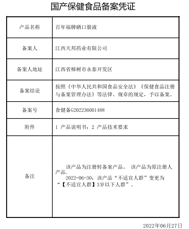 九沐槿百年福牌硒口服液保健功能:補(bǔ)充硒;適宜人群:需要補(bǔ)充硒的4-17歲人群及成人、孕婦、乳母;不適宜人群:3歲以下人群。4-6歲:每日1次,每次1支;7-17歲及成人、孕婦、乳母:每日2次,每次1支;食用方法:口服。本品不能代替藥物。適宜人群外的人群不推薦食用本產(chǎn)品。