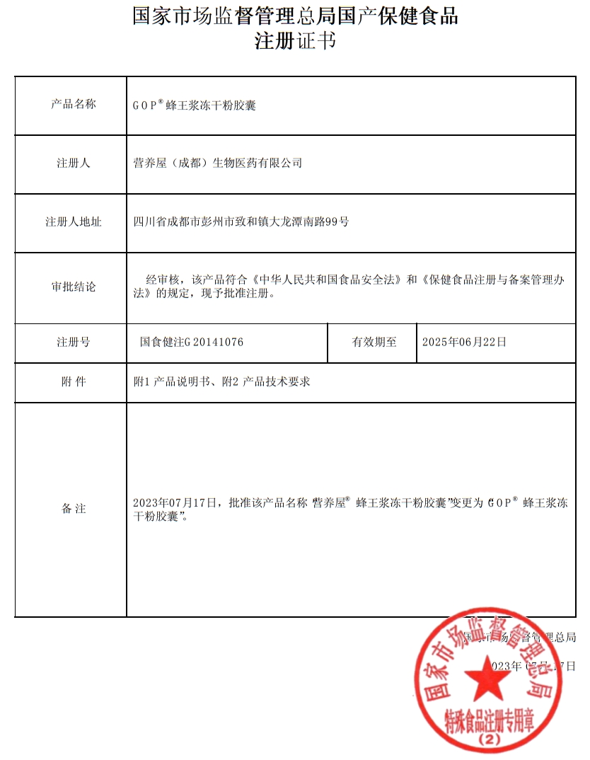 蜜顏素GOP蜂王漿凍干粉膠囊保健功能:本品經(jīng)動(dòng)物實(shí)驗(yàn)評(píng)價(jià),具有增強(qiáng)免疫力的保健功能;適宜人群:免疫力低下者;不適宜人群:少年兒童、孕婦、乳母。每日2次,每次2粒,口服。