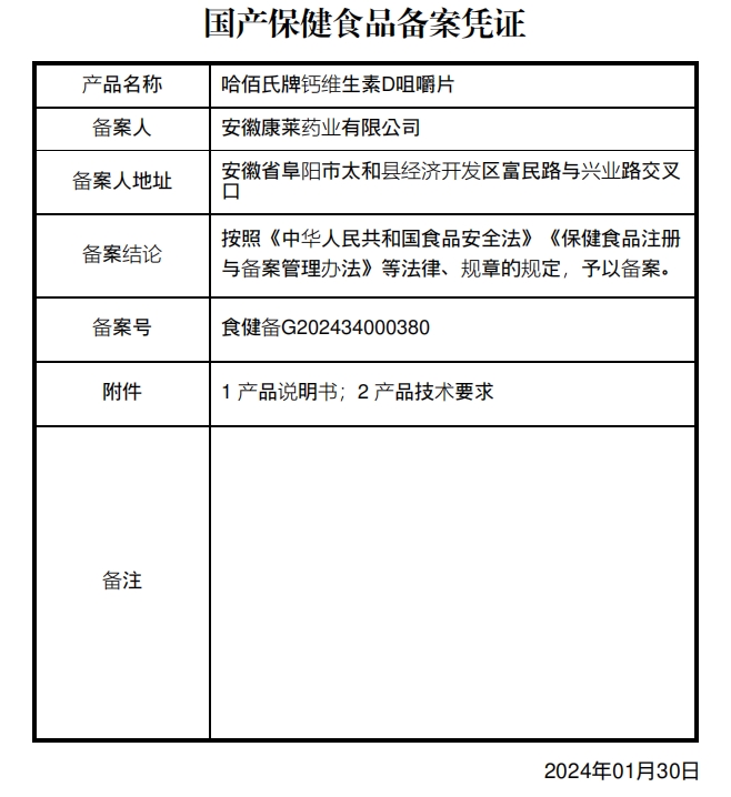 朝旭萊哈佰氏牌鈣維生素D咀嚼片保健功能:補充鈣、維生素D;適宜人群:需要補充鈣、維生素D的4-17歲人群及成人、孕婦、乳母;不適宜人群:3歲以下人群。每日1次,每次2片,食用方法:嚼食。本品不能代替藥物。適宜人群外的人群不推薦食用本產品。不宜超過推薦量或與同類營養(yǎng)素同時食用。