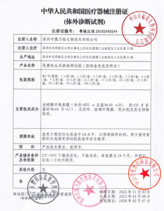 太巧排卵檢測試紙由硝酸纖維素膜(含抗-HCG α亞基McAb α01、抗-LH β亞基的McAb β-A3)、無紡布、玻璃纖維膜、吸水紙及其支持物組成。適用于測定婦女尿液中LH水平,以預測排卵時間,用于指導育齡婦女選擇受孕時機或指導安全避孕。