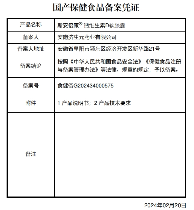 安貞京品斯安倍康鈣維生素D軟膠囊保健功能:補(bǔ)充鈣、維生素D;適宜人群:需要補(bǔ)充鈣、維生素D的4-17歲人群及成人、孕婦、乳母;不適宜人群:3歲以下人群。每日2次,每次1粒,食用方法:口服。本品不能代替藥物。適宜人群外的人群不推薦食用本產(chǎn)品。不宜超過推薦量或與同類營養(yǎng)素同時(shí)食用。