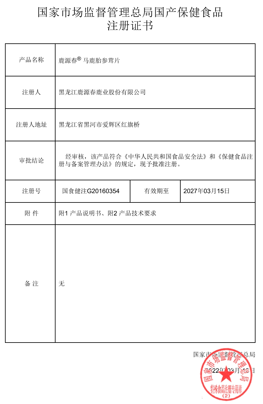 批準(zhǔn)文號:國食健注G20160354批件 生產(chǎn)廠家:黑龍江鹿源春鹿業(yè)股份有限公司