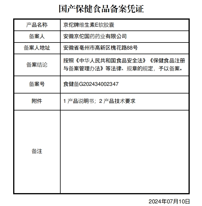 公和堂京佗牌維生素E軟膠囊保健功能:補(bǔ)充維生素E;適宜人群:需要補(bǔ)充維生素E的成人;不適宜人群:10歲以下人群及孕婦、乳母。每日1次,每次1粒,食用方法:口服。本品不能代替藥物。適宜人群外的人群不推薦食用本產(chǎn)品。不宜超過(guò)推薦量或與同類營(yíng)養(yǎng)素同時(shí)食用。