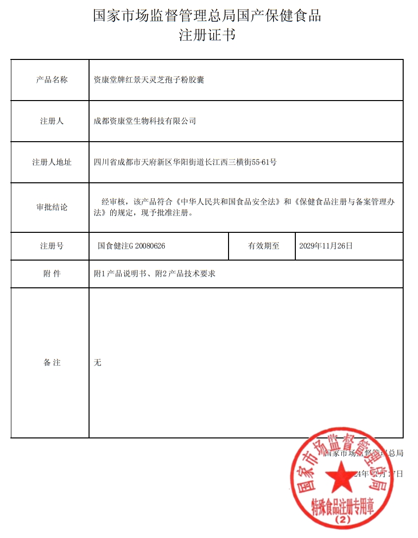 澤知潤資康堂牌紅景天靈芝孢子粉膠囊保健功能:本品經(jīng)動(dòng)物實(shí)驗(yàn)評價(jià),具有有助于增強(qiáng)免疫力的保健功能;適宜人群:免疫力低下者;不適宜人群:少年兒童、孕婦、乳母。每日1次,每次3粒,溫水送食。本品不能代替藥物。適宜人群外的人群不推薦食用本產(chǎn)品。