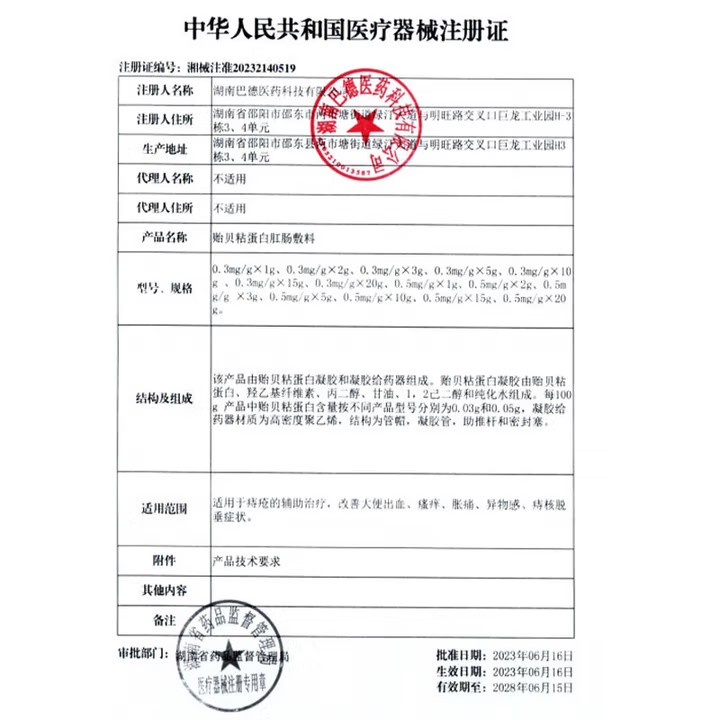 仁和貽貝粘蛋白肛腸敷料由貽貝粘蛋白凝膠和凝膠給藥器組成。適用于痔瘡的輔助治療,改善大便出血、瘙癢、脹痛、異物感、痔核脫垂癥狀。每晚睡前,去除管小帽,換上一次性導(dǎo)入器,將凝膠推入肛門3-6g后撤出。每日一次,7天為一個療程。