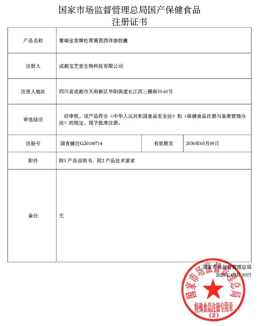 澤知潤紫瑞金堂牌松茸黃芪西洋參膠囊保健功能:本品經動物實驗評價,具有增強免疫力的保健功能;適宜人群:免疫力低下者;不適宜人群:少年兒童、孕婦、乳母。每日1次,每次3粒,晚飯后溫開水沖食。本品不能代替藥物。高硒地區(qū)人群不宜食用;蜂產品過敏者慎用。
