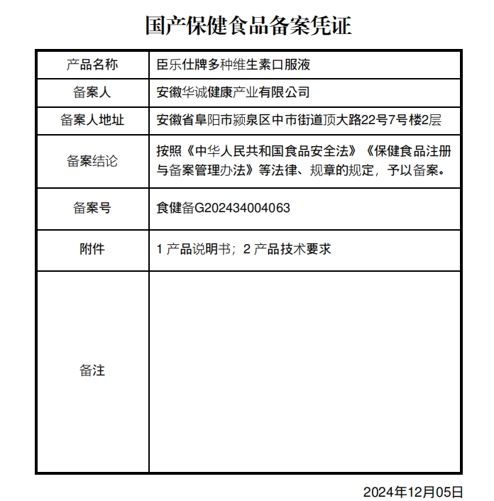 臣樂仕牌多種維生素口服液保健功能:補充多種維生素;適宜人群:需要補充多種維生素的4-17歲人群及成人、孕婦、乳母;不適宜人群:1歲以下人群。4-10歲:每日1次,每次1支;11-17歲:每日2次,每次1支;成人、孕婦、乳母:每日2次,每次1支;食用方法:口服。本品不能代替藥物。