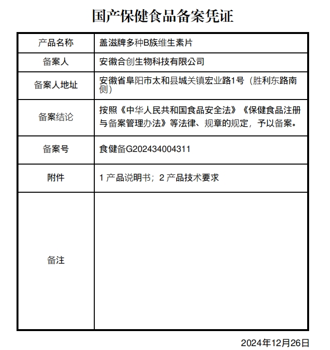 蓋滋牌多種B族維生素片保健功能:補(bǔ)充多種B族維生素;適宜人群:需要補(bǔ)充多種B族維生素的4-17歲人群及成人、孕婦、乳母;不適宜人群:3歲以下人群。每日1次,每次1片;食用方法:口服。本品不能代替藥物。