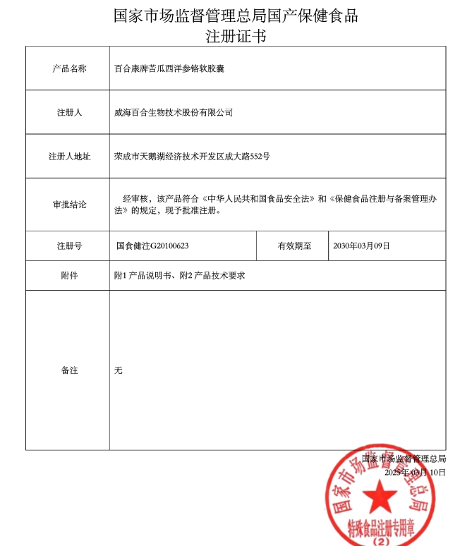 綠港精選百合康牌苦瓜西洋參鉻軟膠囊保健功能:有助于維持血糖健康水平;適宜人群:血糖偏高者;不適宜人群:少年兒童、孕婦、乳母。每日2次,每次2粒,口服。本品不能代替藥物;適宜人群外的人群不推薦食用本產(chǎn)品;本品添加了營養(yǎng)素,與同類營養(yǎng)素同時食用不宜超過推薦量。本品生產(chǎn)過程有輻照。