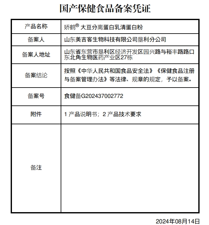 樂家遐齡嬌鶴大豆分離蛋白乳清蛋白粉保健功能:有助于增強(qiáng)免疫力;適宜人群:因蛋白質(zhì)攝入不足而致免疫低下的成人;不適宜人群:少年兒童。每日1次,每次1袋,食用方法:用溫水沖服。本品不能代替藥物。