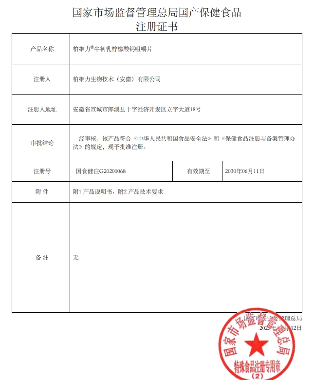 黃金搭檔柏維力牛初乳檸檬酸鈣咀嚼片保健功能:本品經動物實驗評價,具有增強免疫力的保健功能;適宜人群:免疫力低下者;不適宜人群:嬰幼兒、孕婦、乳母。每日2次,每次2片,嚼食。本品不能代替藥物;適宜人群外的人群不推薦食用本產品。