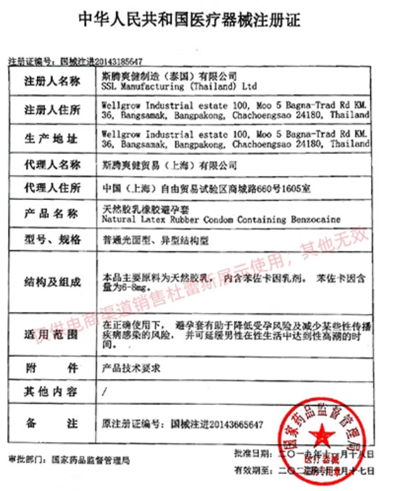 變更情況 2017-02-08“代理人住所:上海市浦東新區(qū)商城路660號1605室”變更為“代理人住所:中國(上海)自由貿(mào)易試驗區(qū)商城路660號1605室”。2018-07-02“注冊人名稱:SSL Manufacturing(Thailand) Ltd ”變更為“注冊人名稱:SSL Manufacturing(Thailand) Ltd 斯騰爽健制造(泰國)有限公司”。2022-03-25 1. 產(chǎn)品名稱:由“天然膠乳橡膠避孕套”變更為“天然膠乳橡膠避孕套 含苯佐卡因”。2. 產(chǎn)品技術(shù)要求:尺寸、爆破體積和壓力等性能指標(biāo)和試驗方法發(fā)生了變更,詳見產(chǎn)品技術(shù)要求變更對比表。
