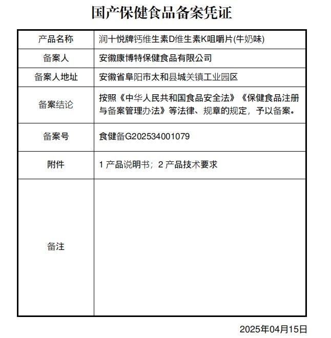 潤(rùn)十悅牌鈣維生素D維生素K咀嚼片(牛奶味)保健功能:補(bǔ)充鈣、維生素D、維生素K;適宜人群:需要補(bǔ)充鈣、維生素D、維生素K的4-17歲人群及成人、孕婦、乳母;不適宜人群:3歲以下人群。每日1次,每次1片,食用方法:咀嚼食用。本品不能代替藥物。